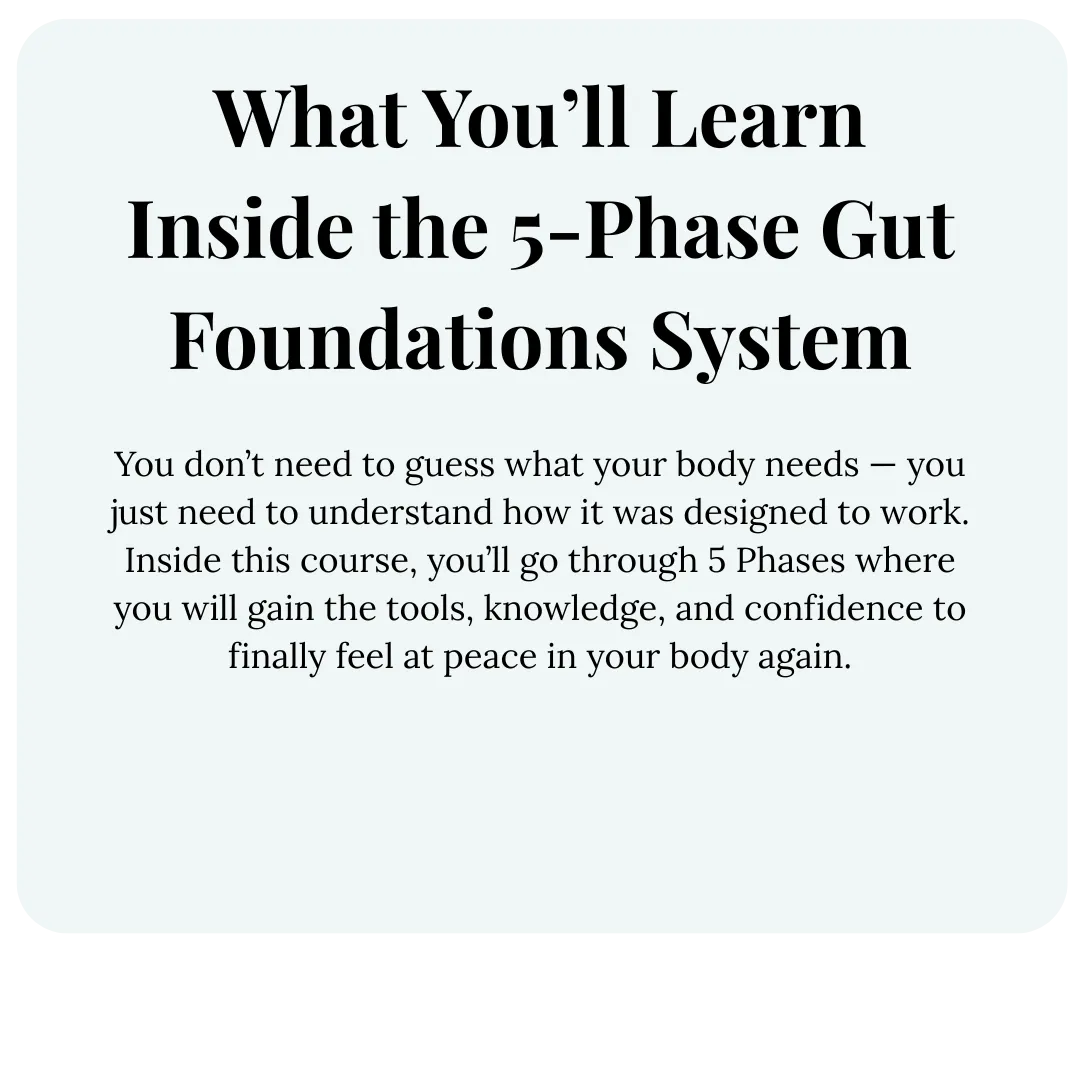 Other programs jump straight into diets and supplements. This course teaches the 5-step system your body must follow to digest properly, so your gut can finally calm down and heal. This isn’t another meal plan. It’s the how behind gut healing.